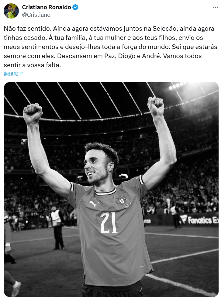 遗憾的是,这样“愤怒”没能够转化成逆转的“动力”,在天空体育、葡萄牙媒体跟进后,葡足协发布公告证实这则消息属实,斯洛特更新了社媒对若塔表达了悼念,就此,确定成真,若塔永远的告别了我们。